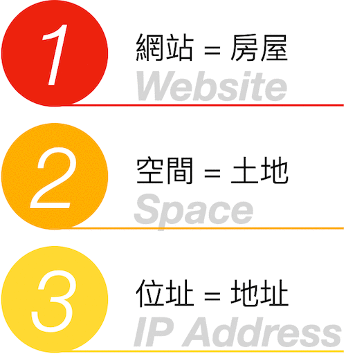 網站是您與您公司面對客戶在網路上溝通的重要橋樑,網站要能正常運行至少需具備三個要素:分別是網站主體、儲存空間、網路位址。網站主體像是房屋,儲存空間像是土地,網路位址就是地址:門牌號碼。