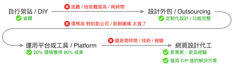 常見架站平台或工具很多,像是 WIX, Weebly, Strikingly, Shopify, WordPress 等都是不錯的選擇。雖然這些架站平台不會像設計外包一樣幾乎 100% 滿足所有設計需求,但僅僅以設計外包 20% 的預算,做出 80% 甚至接近 90% 的功能與成果,對初期創業者而言,仍是我們非常推薦的架站方式。